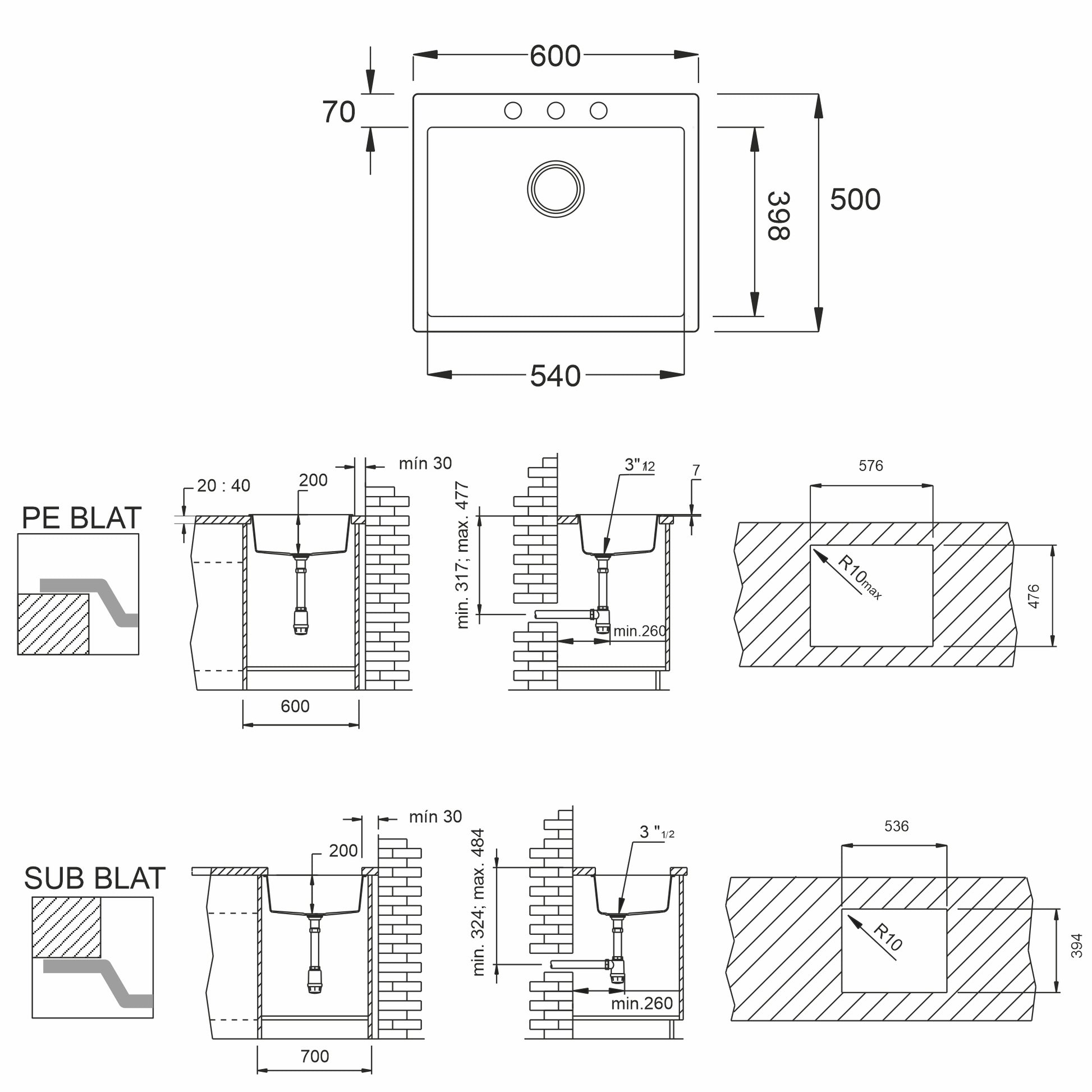 Dimensiune 60x50cm, adancime 20cm, 1 cuva, montare pe blat sau sub blat, finisaj soft compozit